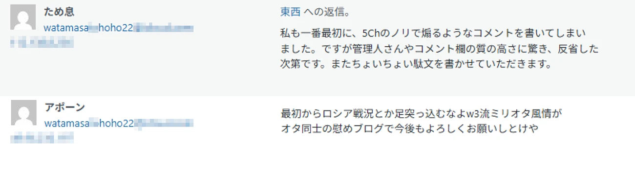 ※「2025年9月6日:watamasa◯◯hoho22@XXXXXXX.com 管理人さんお疲れ様でした。今後もがんばってください。俺は二度とここに書き込みません。ご安心くださいね。さようなら」「2025年8月24日 6:52 AM:watamasa◯◯hoho22@XXXXXXX.com 個人ブログに執拗に批判をするのってどうなん?気に入らないなら見なきゃいいだけなんだけど「思考が偏っているから正してやっているのだ!」とか上から目線だったリ、情報分析のやり方にいちいちイチャモンつけてるのかな。余計なお世話だし、ここまで管理人さんが怒るのは、よっぽど論破したくて粘着してるんだろうな、、、コメ欄荒れるし、容赦なく出禁にしてください」