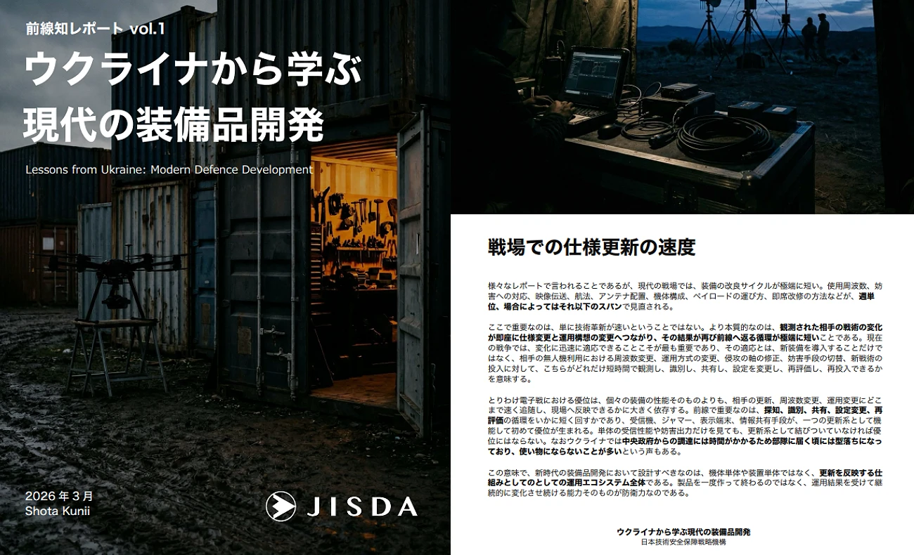 JISDA株式会社は國井翔太氏が2025年11月に設立した安全保障分野における高度な研究開発およびインテグレーションを行う防衛スタートアップ企業で、3月末にはウクライナにおける約3年の継続的な現地調査をもとに日本の安全保障、防衛産業、装備開発が現代戦から何を学ぶべきかを整理したレポートを公開しており、この中で「戦場での仕様更新の速度」を大きく取り上げている。