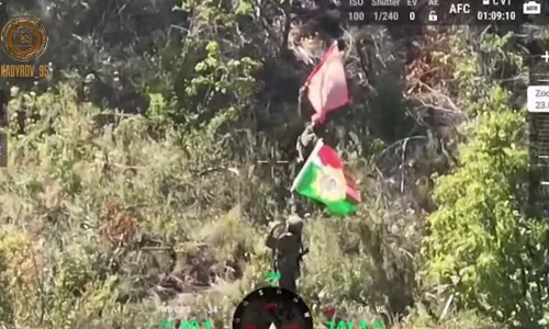 侵攻936日目、チャシブ・ヤールの南でロシア軍兵士が軍旗を掲げる