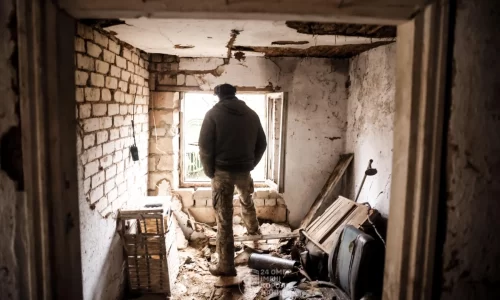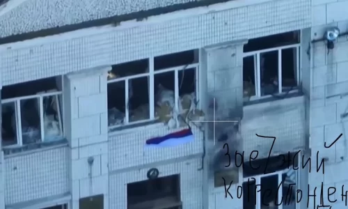 クラホヴェを巡る戦い、ロシア軍兵士が市中心部の市議会で国旗を掲げる