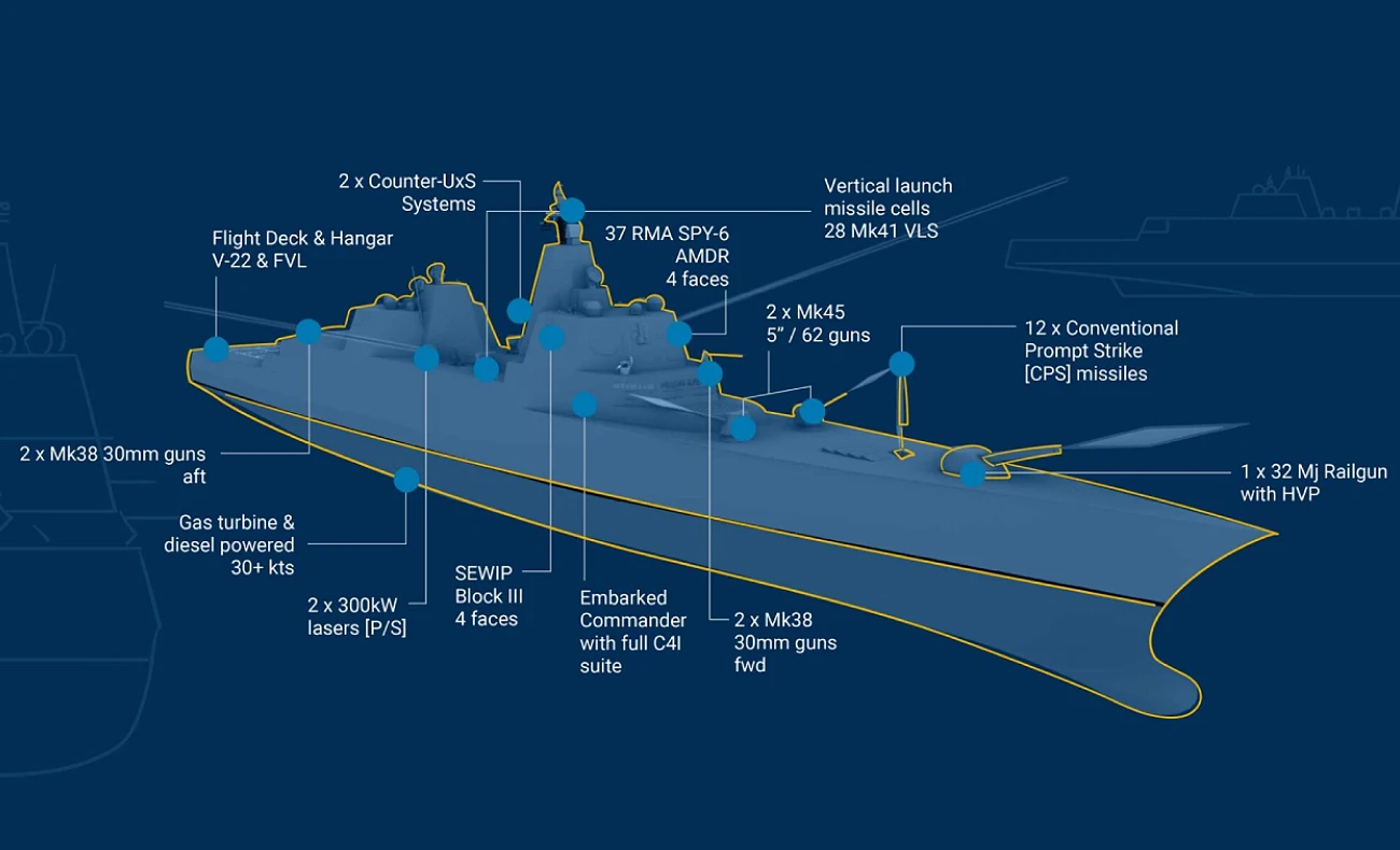 トランプ級戦艦の1番艦がディファイアントなのか、トランプ級戦艦の1番艦がトランプ、2番艦がディファイアントなのかは不明で、Conventional Prompt Strikeは極超音速兵器のこと、レールガンと5インチはHVP=超高速発射体対応で、任務や脅威に応じて単独行動、空母打撃群への参加、水上戦闘群の指揮など役割を受け持ち、無人プラットフォームの指揮統制能力も備えているらしい。