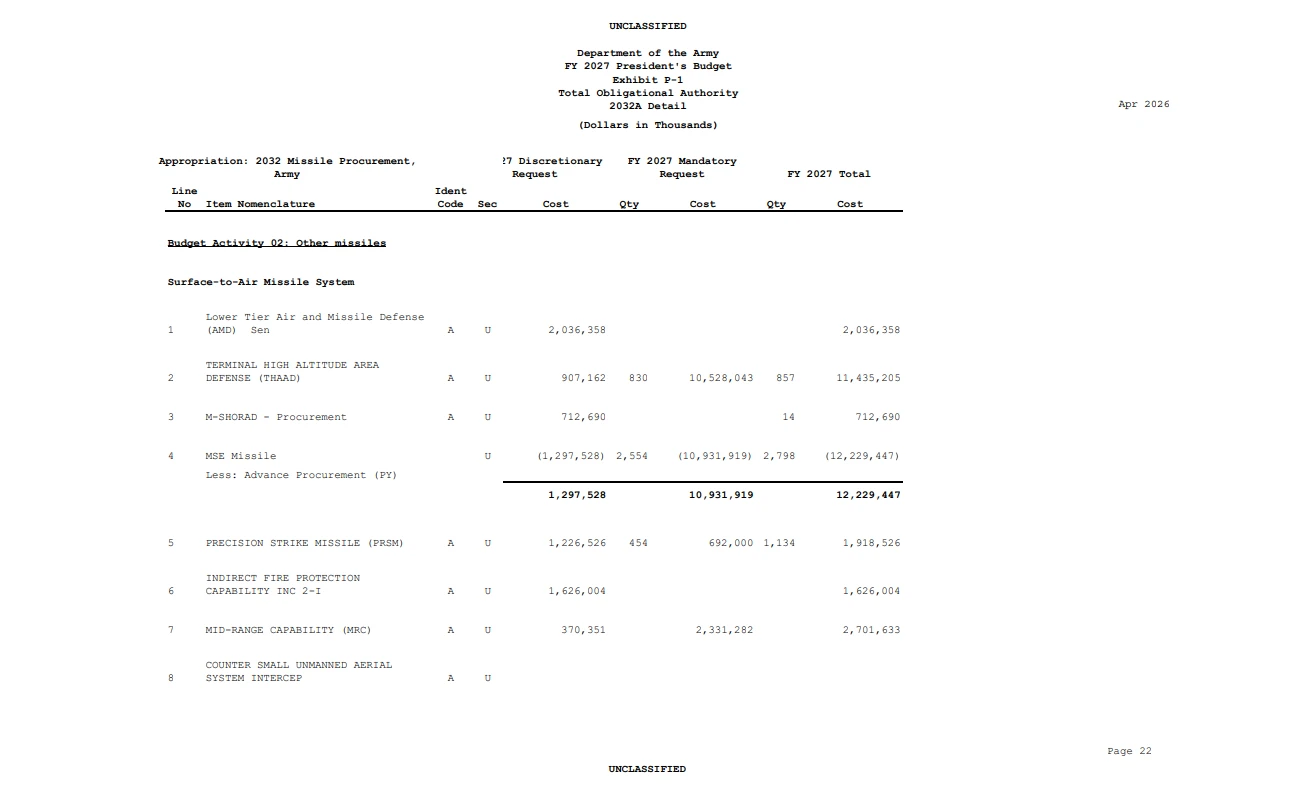 国防総省もFY2027予算説明資料を公開し、まだ全てに目を通しきれてないが、米陸軍はパトリオットシステムの迎撃ミサイル=PAC-3 MSEを2,798発(裁量予算で244発+義務的支出で2,554発)調達するため122.3億ドル=約1.9兆円もの資金を要求しており、1発あたりの調達単価は437万ドルになる。
