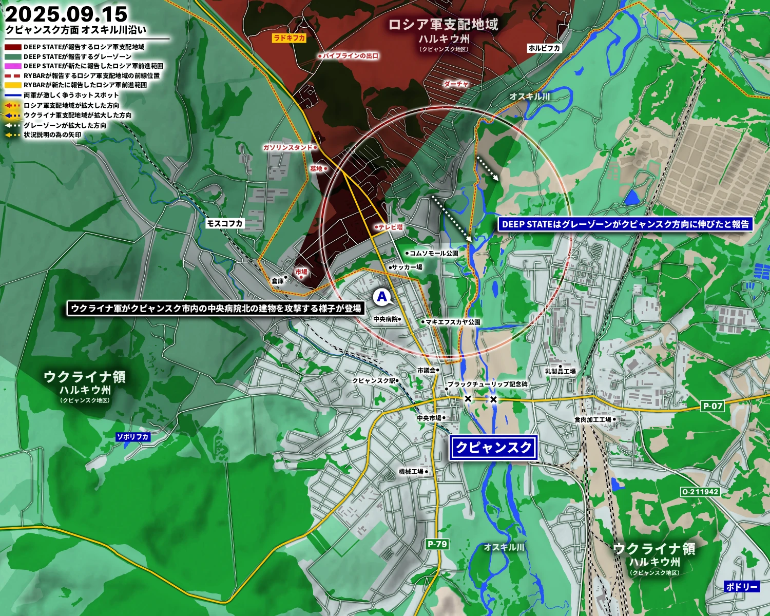 DEEP STATEはクピャンスク方面について15日「グレーゾーンがクピャンスク方向に伸びた」と報告、視覚的にもウクライナ軍がクピャンスク市内の中央病院北の建物=を攻撃する様子が登場した。