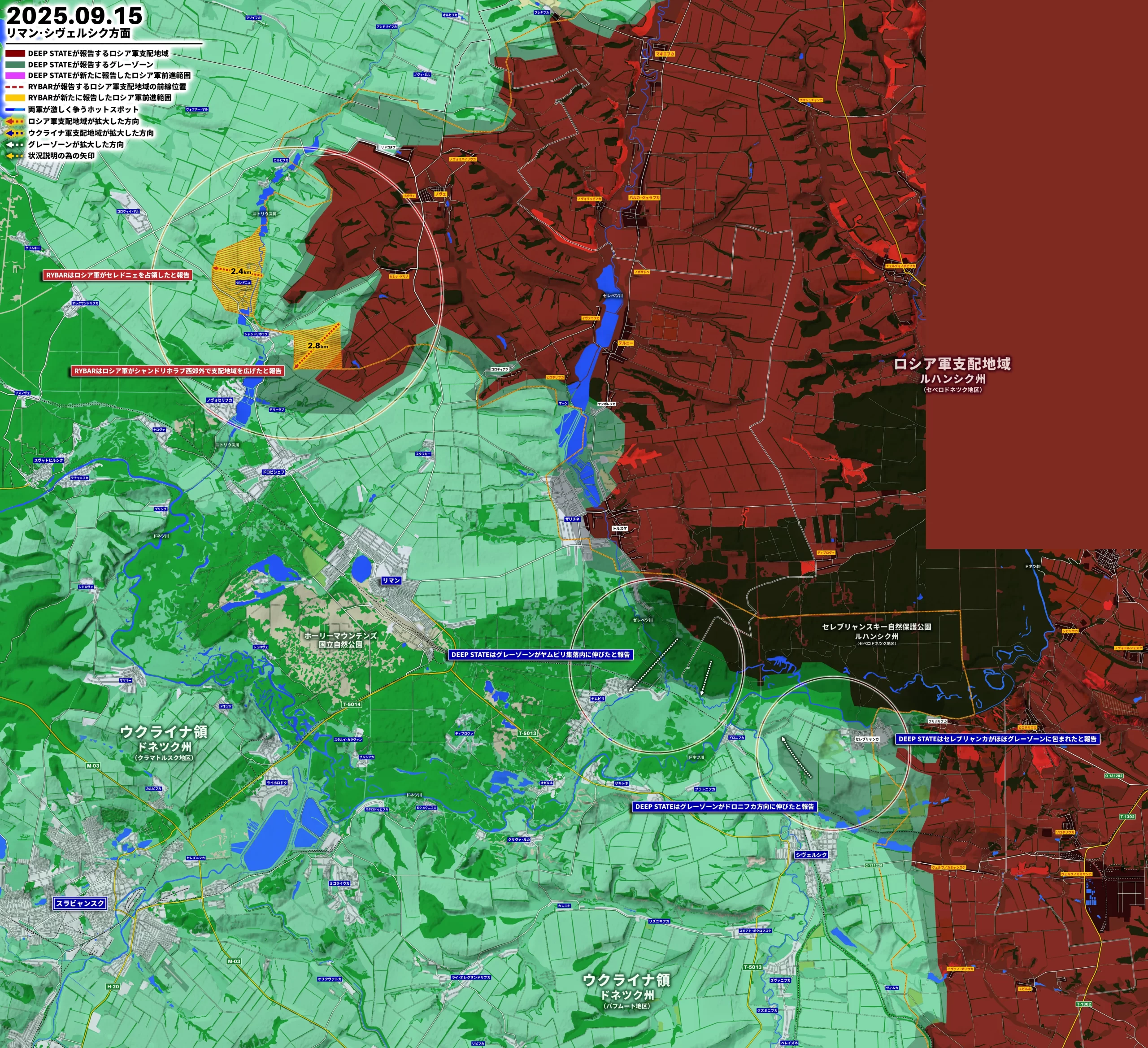 DEEP STATEは15日「グレーゾーンがヤムピリ集落内に伸びた」「グレーゾーンがドロニフカ方向に伸びた」「セレブリャンカがほぼグレーゾーンに包まれた」と、RYBARは「ロシア軍がセレドニェを占領した」「ロシア軍がシャンドリホラブ西郊外で支配地域を広げた」と報告し、ロシア軍はDEEP STATEが懸念していた通りヤムピリに進出し、さらにセレブリャンカの背後にも回り込もうとしている。