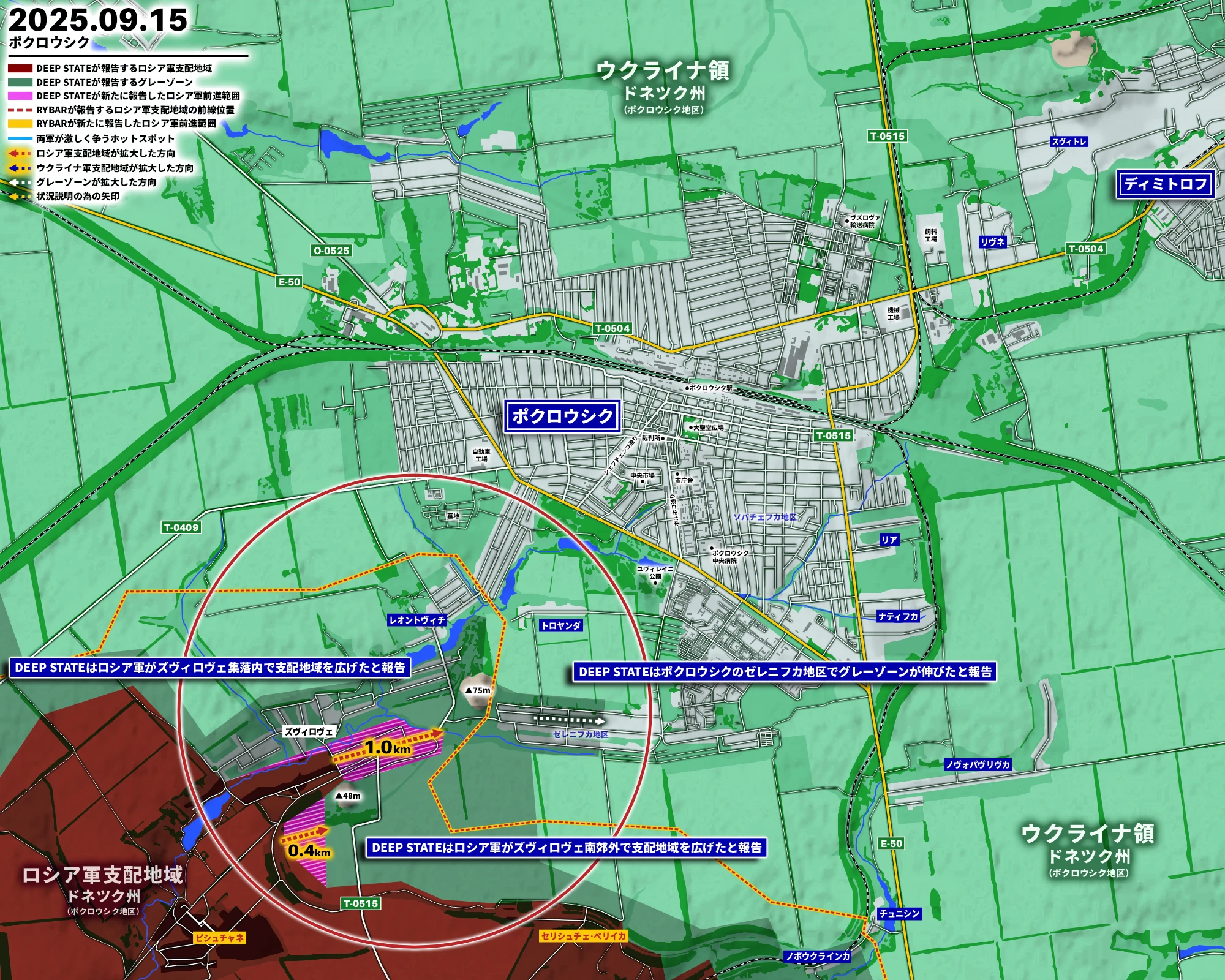 DEEP STATEはポクロウシクについて15日「ロシア軍がズヴィロヴェ集落内で支配地域を広げた」「ロシア軍がズヴィロヴェ南郊外で支配地域を広げた」「ポクロウシクのゼレニフカ地区でグレーゾーンが伸びた」と報告。