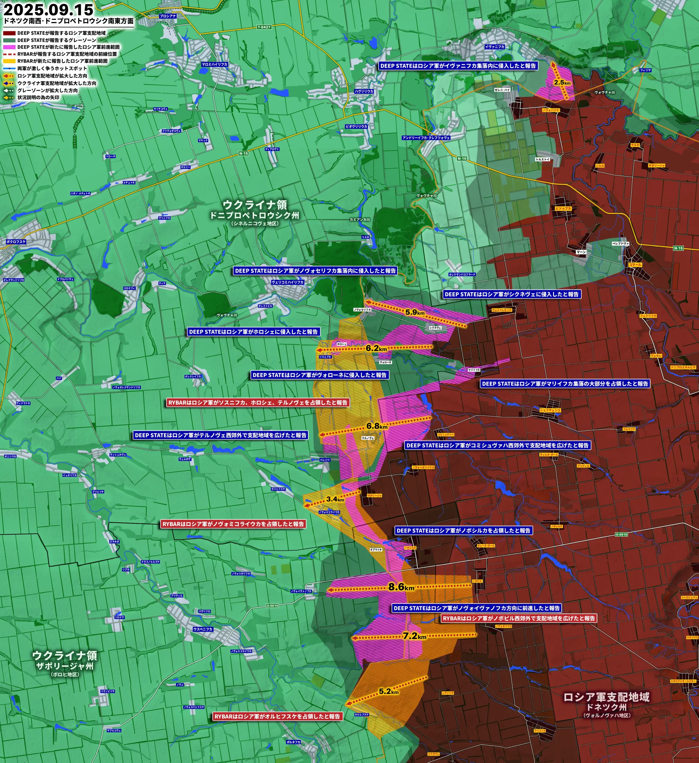 DEEP STATEはドネツク南西・ドニプロペトロウシク南東方面について6日~15日の間に「ロシア軍がイヴァニフカ、ノヴォセリフカ、シクネヴェ、ホロシェ、ヴォローネ集落内に侵入した」「ロシア軍がマリイフカ集落の大部分を占領した」「ロシア軍がテルノヴェ西郊外で支配地域を広げた」「ロシア軍がコミシュヴァハ西郊外で支配地域を広げた」「ロシア軍がノボシルカを占領した」「ロシア軍がノヴォイヴァノフカ方向に前進した」と、RYBARは「ロシア軍がソスニフカ、ホロシェ、テルノヴェ、ノヴォミコライウカ、オルヒフスケを占領した」「ロシア軍がノボピル西郊外で支配地域を広げた」と報告した。