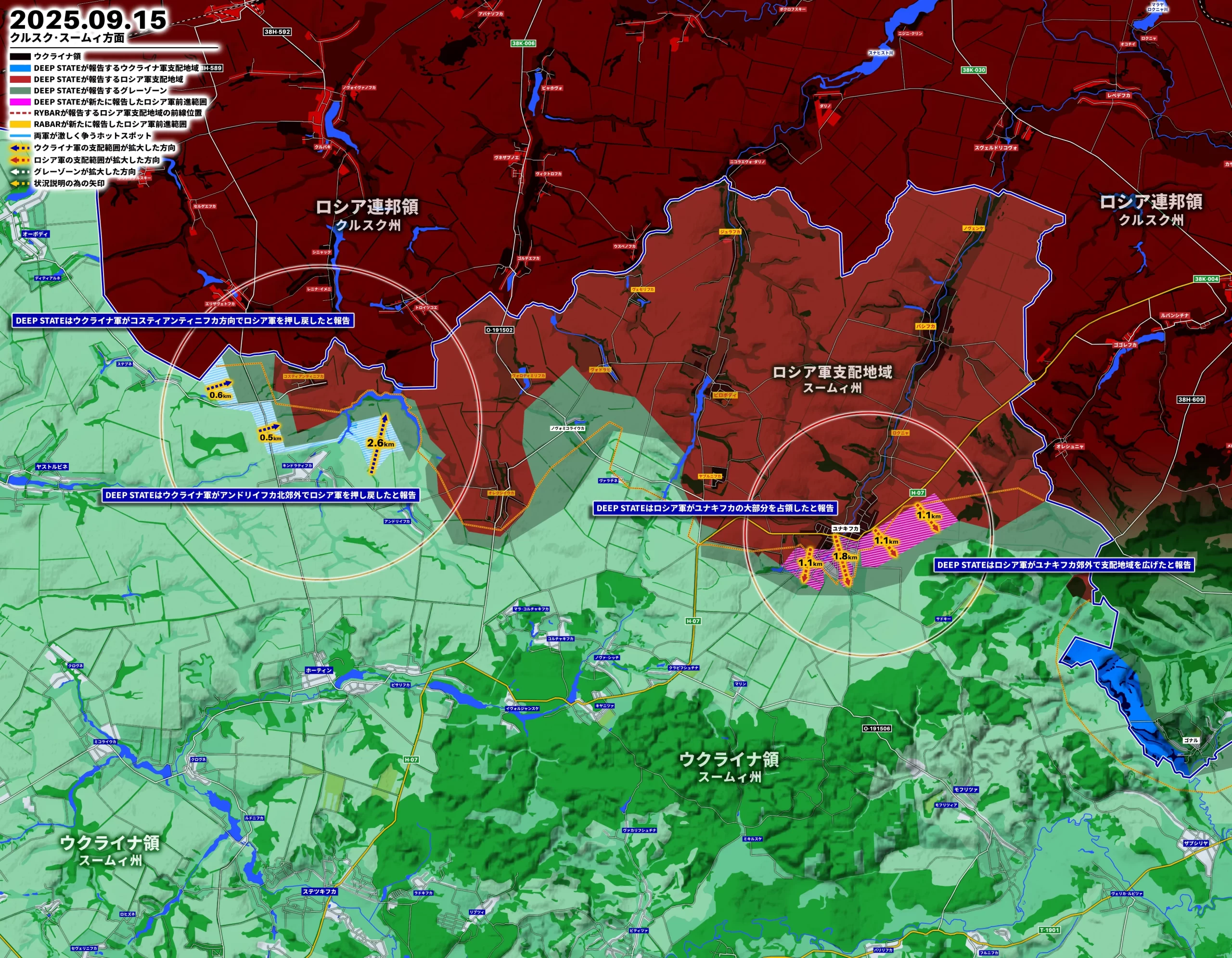 DEEP STATEはスームィ方面について6日「ロシア軍がユナキフカの大部分を占領した」「ロシア軍がユナキフカ郊外で支配地域を広げた」と、14日「ウクライナ軍がコスティアンティニフカ方向でロシア軍を押し戻した」「ウクライナ軍がアンドリイフカ北郊外でロシア軍を押し戻した」と報告。