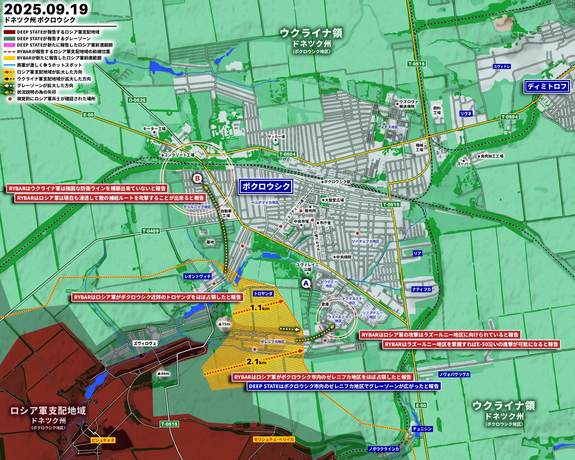 モニター越しに視覚的証拠の位置を線で結ぶタイプの戦況マップではなく、視覚的証拠と現地部隊からの情報で前線位置を評価するRYBARが「ロシア軍はポクロウシク市内に足場を築いた」と初めて報告し、ウクライナ軍がコンクリート製のアパートが立ち並ぶソニアチニー地区やラズールニー地区を失うとロシア軍が線路沿いやE-50沿いに進軍するのが容易になるため、ポクロウシク南郊外の状況は緊迫してきた。