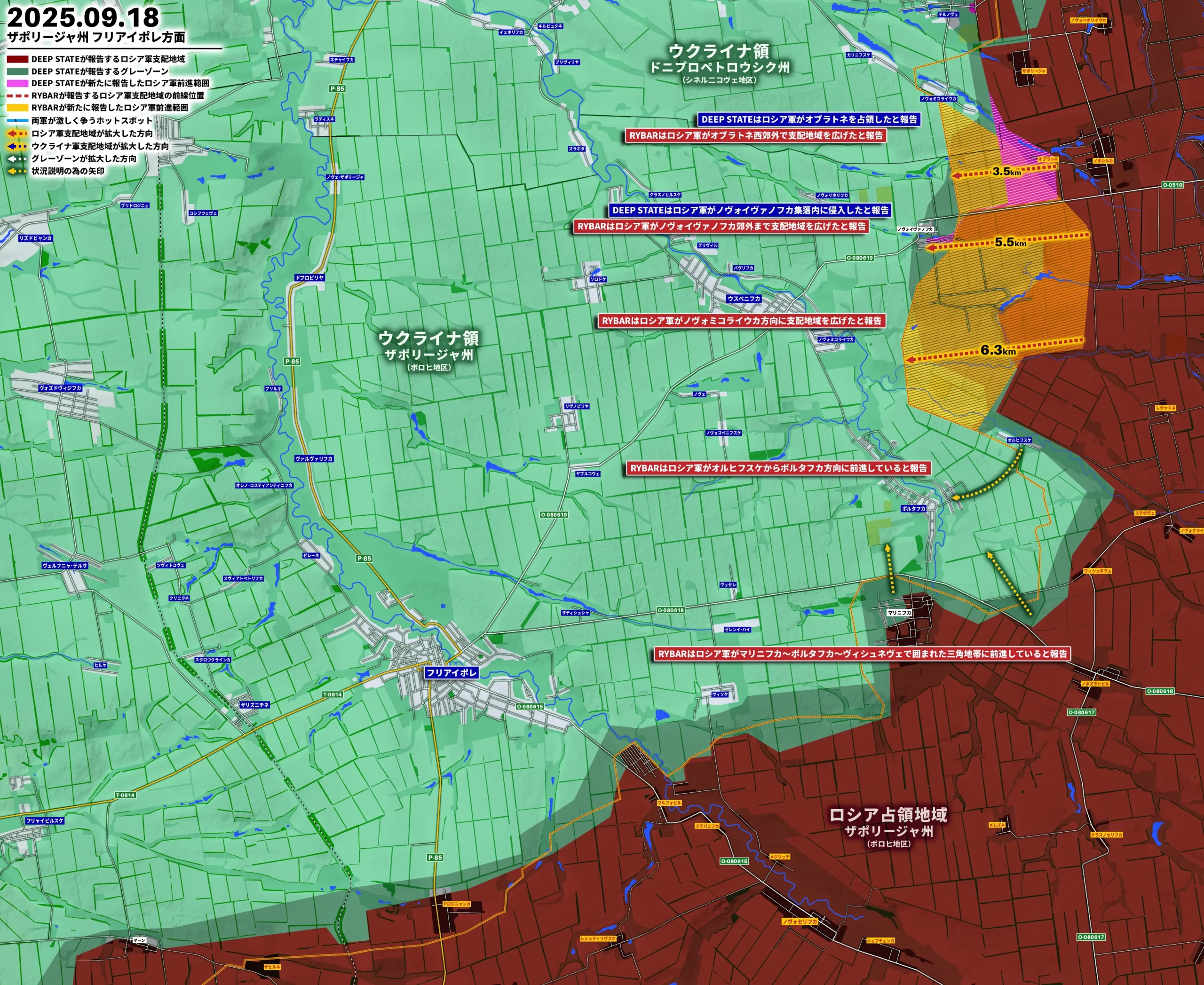 DEEP STATEは18日までに「ロシア軍がオブラトネを占領した」「ロシア軍がノヴォイヴァノフカ集落内に侵入した」と、RYBARは「ロシア軍がオブラトネ西郊外で支配地域を広げた」「ロシア軍がノヴォイヴァノフカ郊外まで支配地域を広げた」「ロシア軍がノヴォミコライウカ方向に支配地域を広げた」「ロシア軍がオルヒフスケからポルタフカ方向に前進している」「ロシア軍がマリニフカ~ポルタフカ~ヴィシュネヴェで囲まれた三角地帯に前進している」と報告。