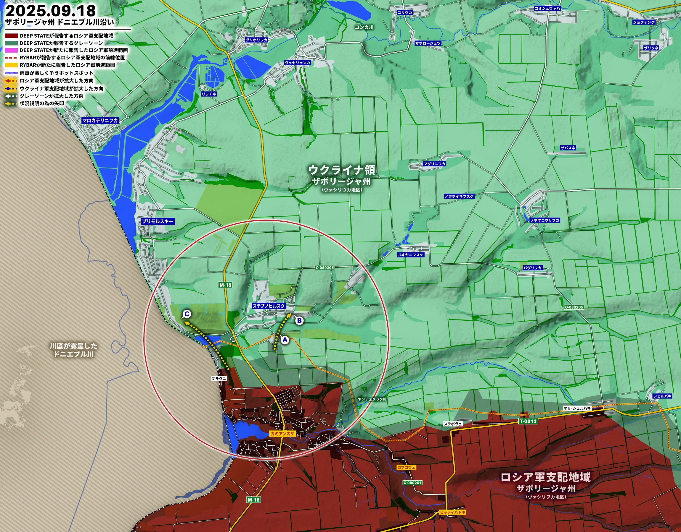 ザポリージャ州の前線ラインは2025年春まで大きな動きはなかったものの、7月に入るとロシア軍がヤンチェクラク川沿いの防衛ラインを突破してカミアンスケを占領し、この方向の戦闘は既にステプノヒルスクやプリモルスキーに移っており、視覚的にもウクライナ軍がステプノヒルスクのアパート地区郊外=Ⓐでロシア軍兵士を攻撃する様子、ウクライナ軍がステプノヒルスク集落内の住宅地区=Ⓑでロシア軍兵士を攻撃する様子、ウクライナ軍がプリモルスキー郊外のダーチャ=Ⓒでロシア軍兵士を攻撃する様子が登場。