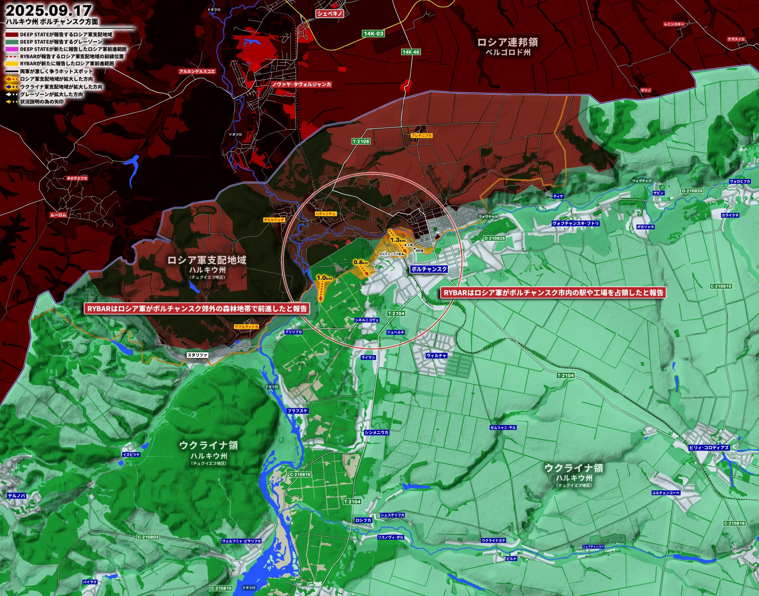追記:RYBARはハルキウ州ボルチャンスク方面について17日「ロシア軍がボルチャンスク市内の駅や工場を占領した」「ロシア軍がボルチャンスク郊外の森林地帯で前進した」と報告した。