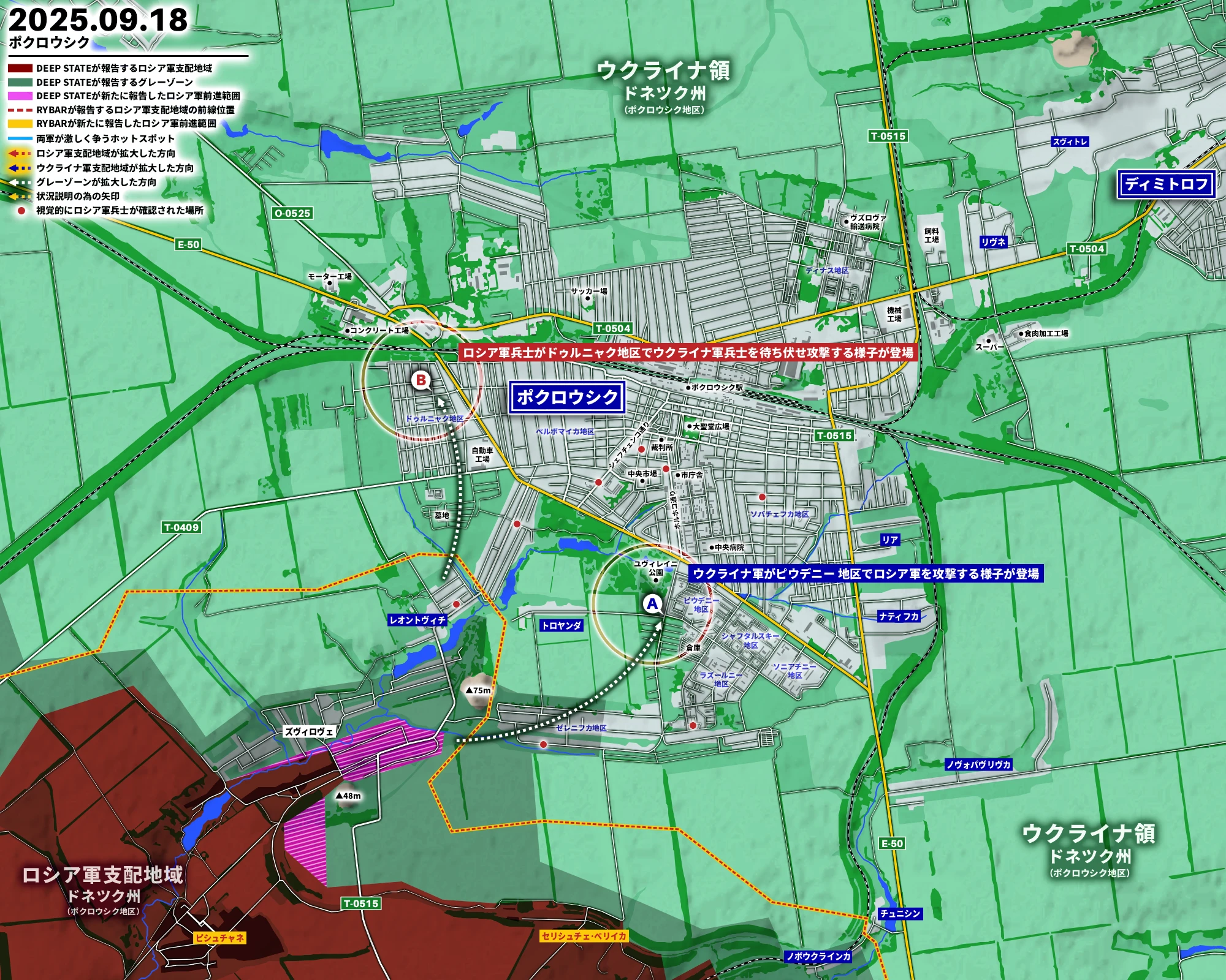 追記:ウクライナ軍がポクロウシク市内のピウデニー 地区でロシア軍を攻撃する様子Ⓐ、ロシア軍兵士がドゥルニャク地区でウクライナ軍兵士を待ち伏せ攻撃する様子Ⓑが登場