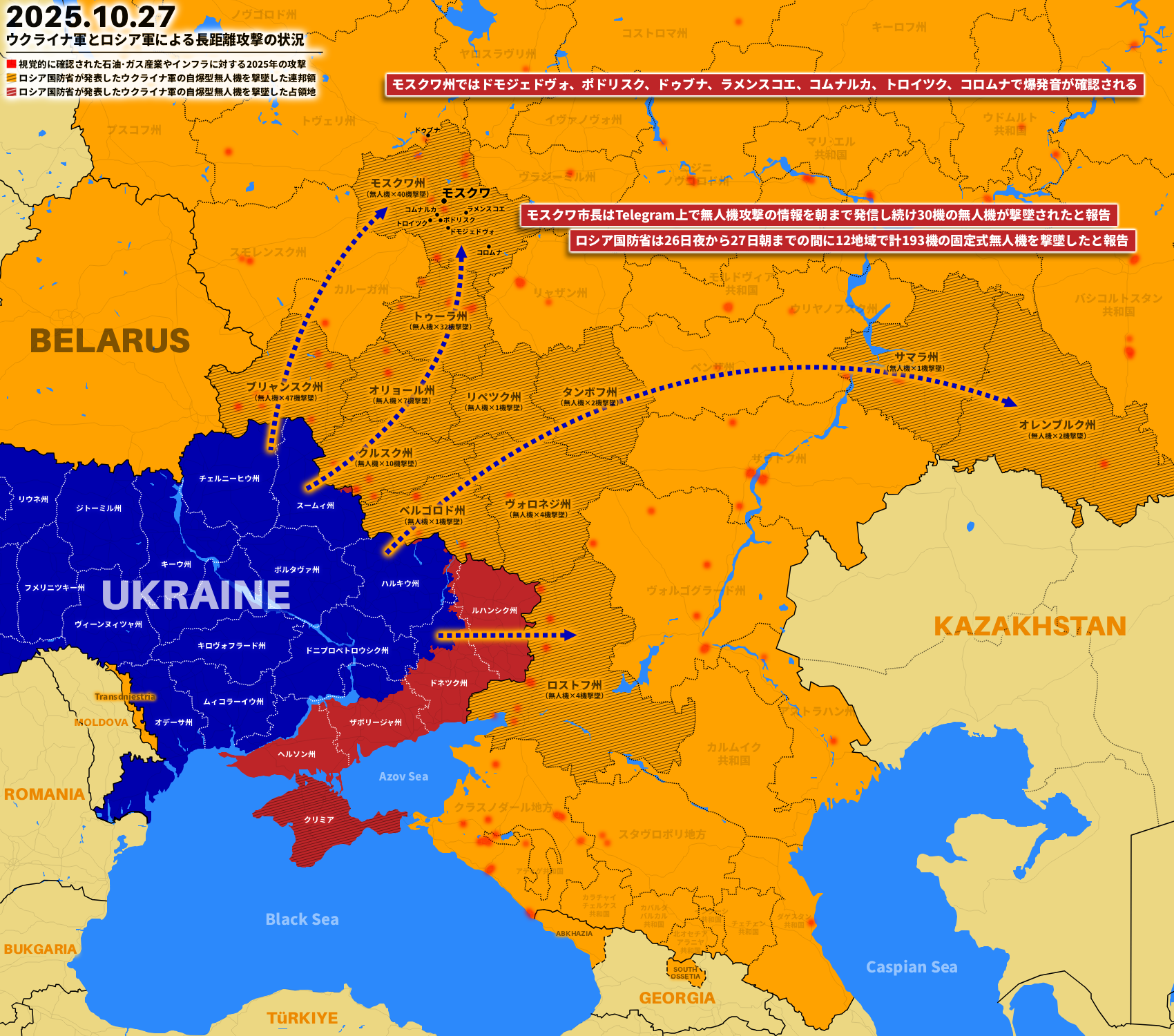 ロシア国防省は27日「26日夜~27日朝までにモスクワ州、トゥーラ州、オリョール州、リペツク州、タンボフ州、ブリャンスク州、クルスク州、ベルゴロド州、ヴォロネジ州、ロストフ州、サマラ州、オレンブルク州上空でウクライナ軍の固定翼式無人機を計193機撃墜した」「モスクワ州で撃墜した40機の内36機が首都モスクワに向かっていた」と報告、これまでにロシア国防省が報告した1ヶ月間の最大撃墜数は1,824機(今年7月)だったが、10月1日~27日までに撃墜した無人機は2,000機の大台を突破した。
